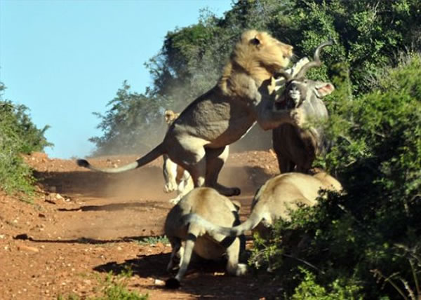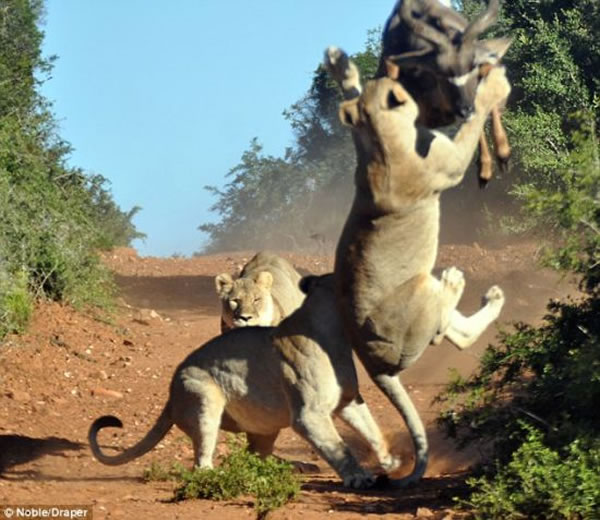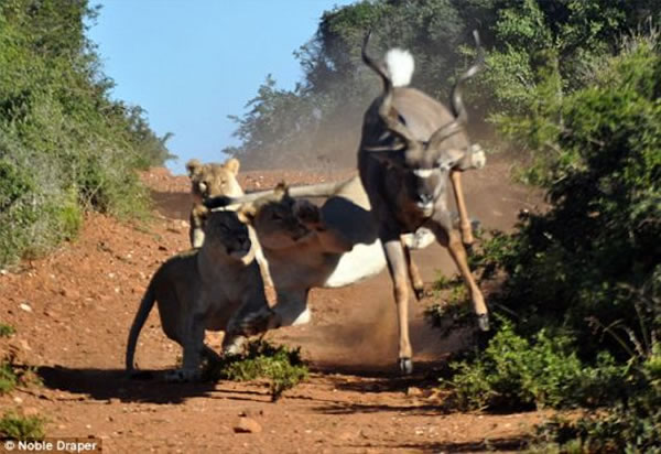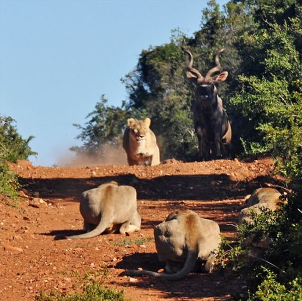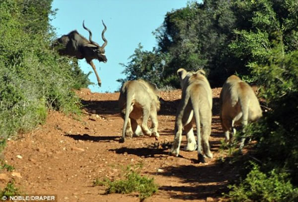 英国旅行队最近在南非东开普省的一个野生动物保护区看到四头狮子围攻一只羚羊的惊险一幕,不过最终那只无助的羚羊凭借惊人的一跃,跳出包围圈,成功狮口脱险。四头羞愧难当的狮子只得继续忍饥挨饿。