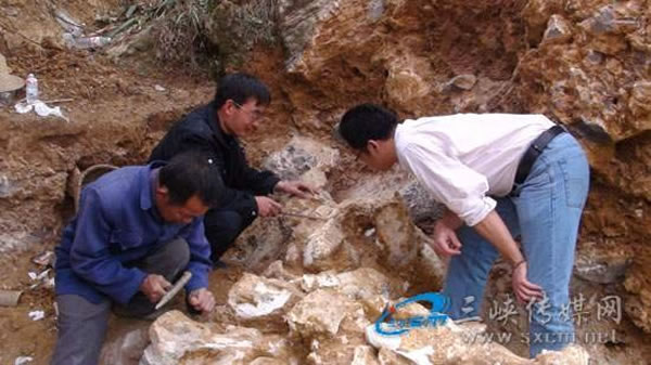 2007年5月4日,重庆化石爱好者张健评来到万州盐井沟进行实地调查。老张在盐井沟的考察,很快有了意外的发现,在一处荒坡的下面,他发现了一块白色石头,凭借多年积累的化石常识,张健评知道这不是一块普通的石头,经过进一步的考察,他判定这应该是一只"巨无霸"东方剑齿象的骨骼化石。