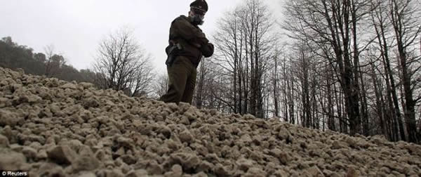 佩戴面罩防止毒气入侵的警员站在火山喷发产生的大量浮石上