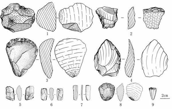图4 调查发现的部分石制品:1.石核,2.单刃刮削器,3.单刃刮削器,4.尖状器,5.砸击石核,6.细石叶石核,7.细石叶中段,8.端刮器,9.细石叶石核。(仪明洁、高星等供图)