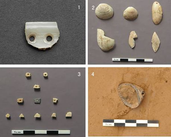 山西柿子滩遗址出土的蚌制品和鸵鸟蛋壳制品:1.S12A地点蚌饰品;2.S9地点蚌饰品;3.S9地点鸵鸟蛋壳;4.S29地点蚌饰品(宋艳花供图)
