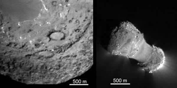 坦普尔1号的一小部分(左)和 哈特雷二号(右)的比较,图像比例大致一样,摄影的工具也几乎相同。 撞击目标传感器(ITS)(左)的图像 iv9000675,9.1米每像素。 (右)MRI图像mv5004032,8.5米每像素。太阳是在右边。欲了解更多信息,请参阅原稿中的图1。
