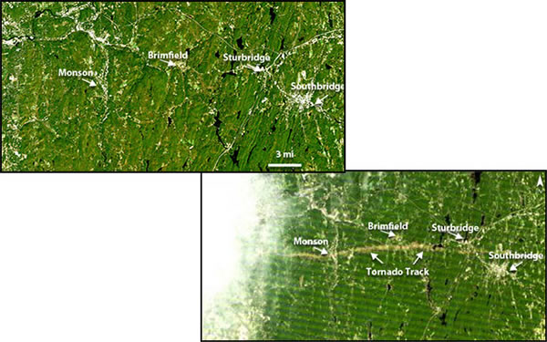 在卫星图像中,本月早些时候横扫美国马萨诸塞州的一场龙卷风所留下的冗长破坏轨迹清晰可见。6月10日,美国宇航局(NASA)公布了一颗地球资源卫星分别于6月1日前(上图)后(下图)拍摄的图像——这场龙卷风当天从斯普林菲尔德市到斯特布里奇市“雕刻”了一条63公里长的轨迹。在卫星于2011年10月8日拍摄的图像中,只能够看到城市、道路以及其他人类住宅区的痕迹。然而在6月5日拍摄的图像中,因龙卷风破坏而形成的一部分浅色走廊——其最宽处约为800米——则很容易被识别出来,这在很大程度上是因为最大风速为每小时219公里到266公里的EF3龙卷风,将所到之处的植被统统摧毁,从而增加了受损地貌与附近完好如初的树木之间的对比。有关这场龙卷风破坏情况的完整卫星图像并未生成,这是因为在地球资源卫星掠过事件发生区域上空的仅有的一次时,龙卷风轨迹的最西端被云层所遮挡(下图左上处白斑)。