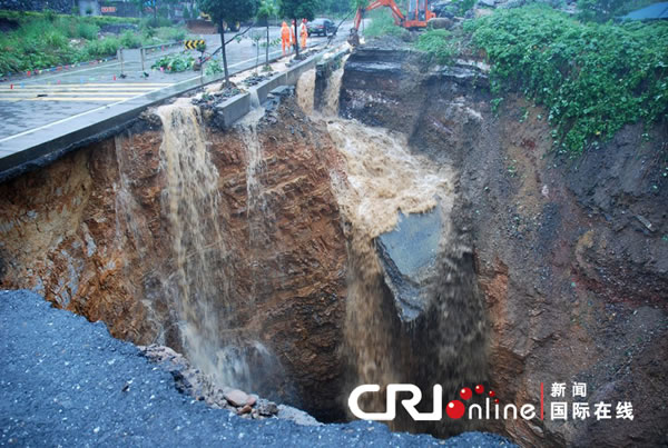 该处从凌晨开始坍塌,从原先的几米到现在的十几米,目前,还有进一步扩大的趋势。针对这一情况,当地市公路部门立即设置了安全警示标志,提醒过往车辆行人安全,并调用挖机及时进行引水改道,避免该处路基再次冲刷。目前,该处右侧已封道,只能左侧半幅通行。