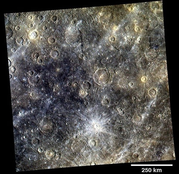 信使号航天器拍摄到水星表面分布着火山平原、巨大的陨坑和大量的硫磺。据悉,目前信使号在为期1年的环绕水星勘测任务中已服役3个月,拍摄照片显示水星表面陨坑中富含硫磺沉积物,它不同于太阳系内其它行星。