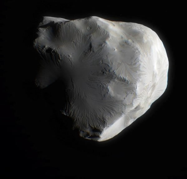 图2这张Helene卫星的图像,北极点是向下的,这是因为卡西尼探测器是倒着拍摄的。同时也是一个Helene卫星的3D图像,这个图像由卡西尼探测器成像控制室的Patrick Rutherford 任务专家后期处理,如果你有红/蓝3D眼睛,就可以清楚地看到整个卫星的三维结构。