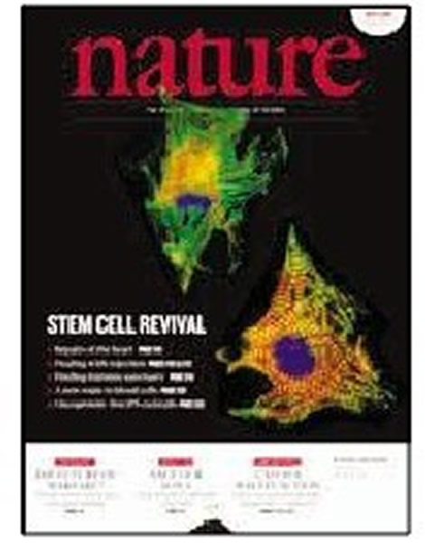 本期Nature关注干细胞研究中一些最热门的话题。研究人员发现,名为“胸腺肽β4”的肽能够刺激成年心脏中的固有细胞(resident cells)而生成新的心肌细胞。这一发现使心血管再生医学中基于细胞的疗法又前进了一步。本期封面所示为培养中正在成熟的心肌细胞,其中粗的肌浆球蛋白丝用红色表示,细的用绿色表示。