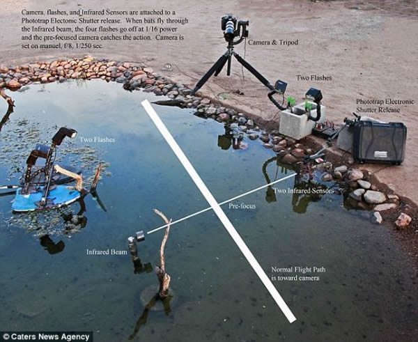 他在家里设计组装了这套系统,到目前为止已经取得了惊人的效果:他拍摄到蝙蝠盘旋冲向自己猎物的场景,跳进小池子泡澡或掠过水面喝水的场景。他在小池子边设置了这样的隐蔽拍摄设备。
