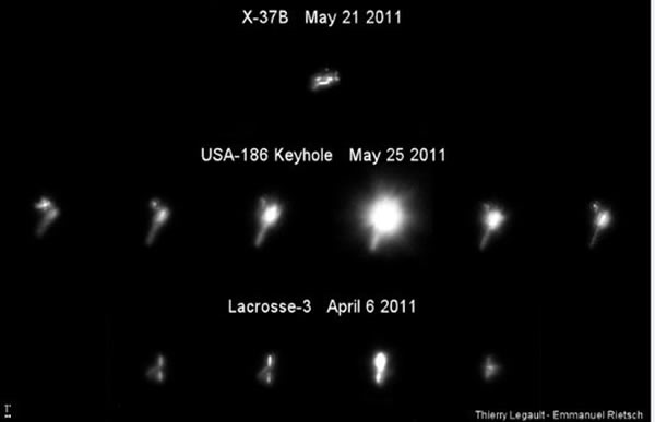 从2010年10月开始,Legault和Rietsch使用AUTO GUIDE控制系统,在DMK 31AF03 CCD单色Firewire天文摄影相机的帮助下,配合200mmFL口镜头、寻星软件和高桥EM400赤道仪,对轨道上的目标进行快速跟踪拍摄。图1的图像中,拍摄到位于轨道上的三个不同型号的间谍卫星,同时也包括被美国军方列为绝密级别的X-37B太空战机。