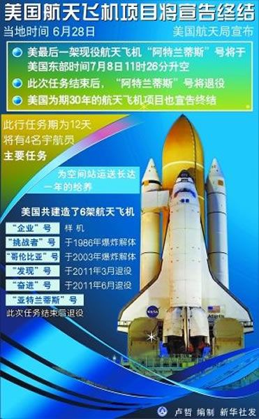 美国航天局6月28日宣布,美最后一架现役航天飞机“阿特兰蒂斯”号将于7月8日开始最后一次飞行,此次任务结束后,“阿特兰蒂斯”号将退役,美国为期30年的航天飞机项目也宣告终结。