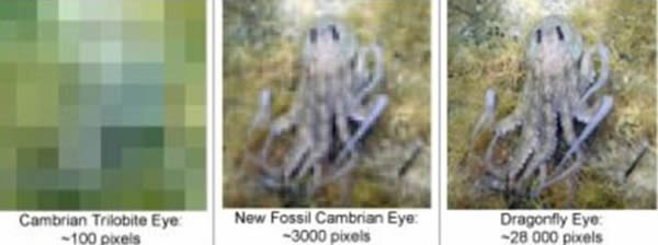含有这些复眼化石的岩石里还有大量远古海洋生物化石,其中很多是以前未知的。它们包括像三叶虫的原始生物、披甲虫(armoured worms)和长着给食附属肢、会游泳的大型食肉动物。最近发现的这些化石复眼观察这个世界的像素超过3000,因此它们的拥有者在当时具有很大的视觉优势,因为同一时期的其他动物的像素大约只有100,看到的一切都非常模糊。