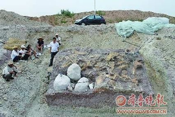 6月10日,诸城市恐龙文化研究中心的挖掘人员正在对诸城白垩纪恐龙地质公园恐龙涧化石隆起带进行挖掘。在自东往西挖掘到分布区的中间地带时,挖掘人员清理后意外发现,此处的恐龙化石分布非常密集,不少化石相互交错、叠压,不能使用常规的挖掘方式。