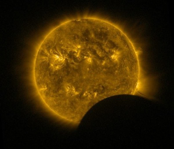 欧洲航天局Proba-2探测器在地球轨道上拍摄到罕见空间日偏食,这张图像由该探测器上的主动式太阳观测像素传感器和图像处理系统的光谱分析仪在极紫外波段下拍摄。在图像中,这次空间日偏食是由月球运行到探测器和太阳之间,月球挡住了部分太阳表面图像,这个发生在近地空间上的情景在地球上几乎没有人可以看到,这也就被美国航空航天局的天文学家戏称为“隐形的日偏食”,由于轨道上的探测器是在不断运动着的,所以其拍摄到这样的图像也是一个非常难得和巧合的事件。