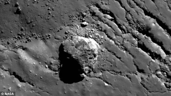 这是第谷陨石坑的中央峰顶的俯视图,它着重凸显了这块直径400英尺(121.92米)的巨砾