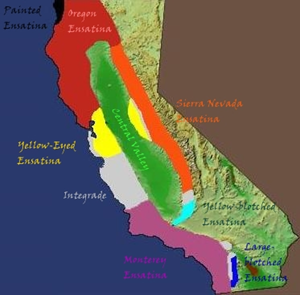 埃氏剑螈(Ensatina eschscholtzii) 在美国加州沿中央谷呈环状分布,这是生物演化正在发生的证明,因为地理位置相邻的剑螈个体可交配并生下可育后代,但两端的种群相遇时已经不能杂交,可以看作是两个不同的物种了。