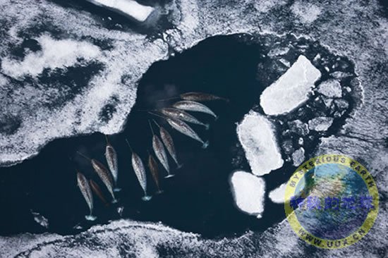 National Geographic photographer Paul Nicklen captured this aerial photo of narwhals taking a breather in an ice hole off Baffin Island in Arctic Canada.