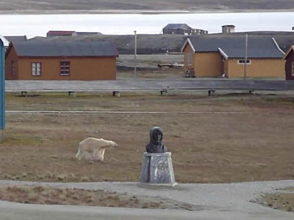 北极熊向极地探险家阿蒙森的雕像走来(北极黄河站2011年夏季考察队拍摄)