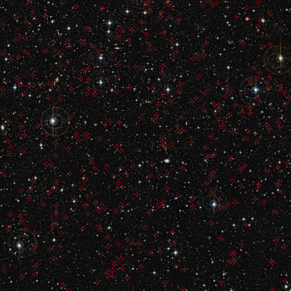 这就是COSMOS视场,由加拿大-法国-夏威夷联合望远镜(CFHT)拍摄。从中可以识别出大量非常暗弱的星系。一项据此以及来自欧洲南方天文台和XMM-牛顿空间望远镜的数据进行的研究带来了一个出乎意料的结果。科学家们发现黑洞一般是由其所在宿主星系内部的机制所激活的,如星系盘不稳定,星爆等,而非之前认为的星系合并或相互扰动。这张图像中一部分核心含有超大质量黑洞的活动信息被用红色标记标示了出来。