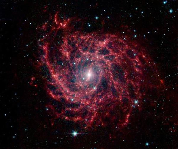 据美国太空网站报道,日前,美国宇航局斯皮策太空望远镜最新发布照片显示一个螺旋星系的星光和微妙的灰尘结构组合成一个明亮的太空漩涡蜘蛛网。