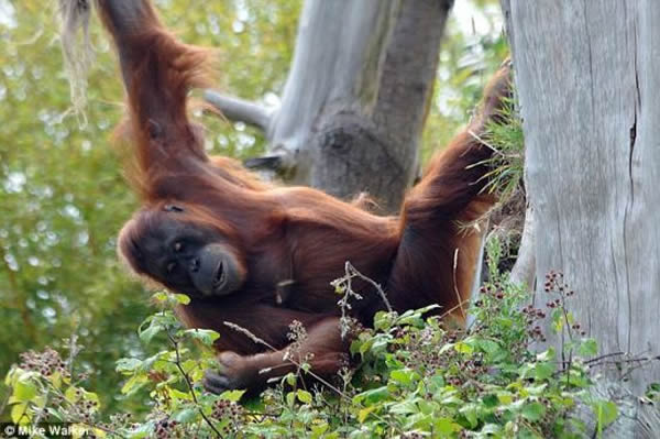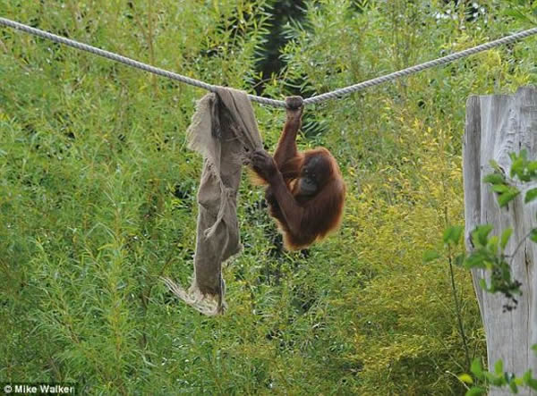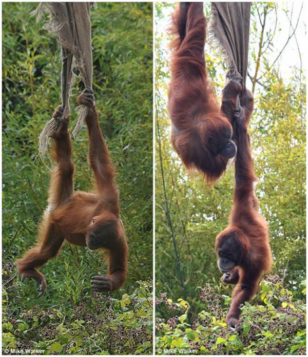 这些令人难以置信的照片显示的是法国泽西岛杜瑞尔野生动物保护信托基金会围场里的红毛猩猩为了吃到它们喜欢的黑莓,表现出来的非凡技艺和创新精神。它们借助一片旧布条,让自己倒挂在灌木上空的缆索上,采摘它们最喜欢的果实。