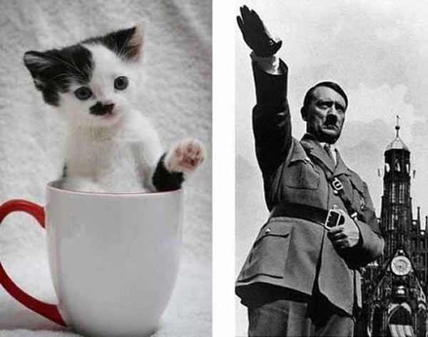 小猫的头上也有黑色斑块,神似侧分边的头发,跟希特勒惯有的造型如出一辙