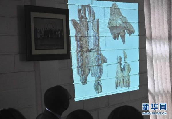 8月2日,在乌干达首都坎帕拉召开的新闻发布会上,古猿类头骨化石的图片被投射在墙上。乌干达政府官员和法国科学家2日在坎帕拉宣布,两国科学家在乌干达东北部发现了一个距今约2000万年的完整古猿类头骨化石。