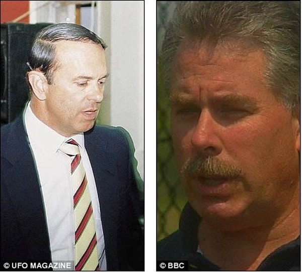 哈尔特(左)在递交给国防部的一份报告里称,他认为那些光来自地外,但是凯文-康德(右)承认,他在该基地工作时,曾对同事做了一个恶作剧