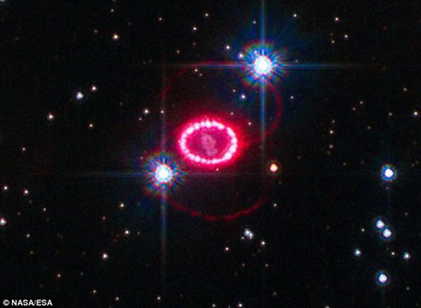 哈勃太空望远镜拍摄的一张超新星1987A图像。科学家认为当一颗恒星以猛烈超新星形式死亡时,其行星系统内的行星可能会被巨大的力量弹出离开原来的轨道,漫游在星系中而幸存下来
