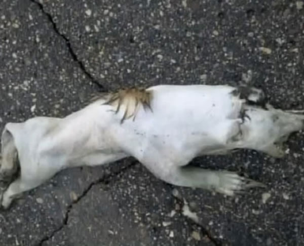 为什么它看上去体色惨白且全身无毛呢?这可能是由于这具动物死亡时血液淤积或者凝结,在尸体腐烂时多数毛发都已脱落。为什么从背部角度看这只动物如此畸形呢?或许是由于尸体被抛弃在街道,经汽车或者卡车碾过所致。