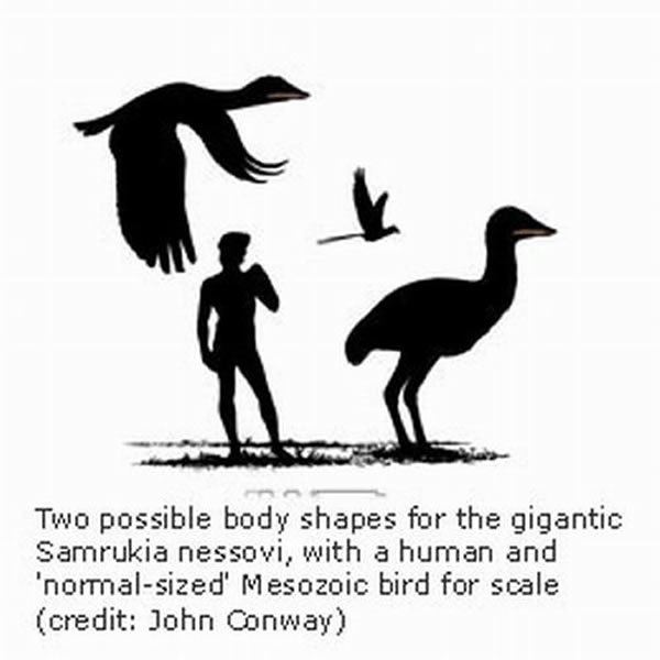 如果这种巨型鸟不能飞行,它可能比鸵鸟更高;如果它可以飞行,其翼展将超过信天翁。这项研究报告发表在英国《生物学快报》上。目前,科学家将这种史前巨鸟命名为“Samrukia nessovi”,是以中亚哈萨克人神话中凤凰的名称“samruk”,以及1995年逝世的著名俄罗斯古生物学家列弗-内索维(Lev Nessov)的姓名而命名的。