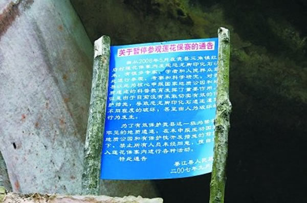 在帖中,网友还贴出了一张关于綦江政府2007年所立的“关于暂停参观莲花保寨的通告”,通告上明确写着“禁止所有人员未经同意,擅自进入莲花保寨内进行各种活动”。