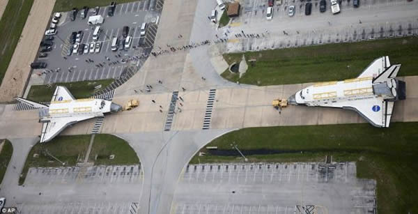 宇航局雇员们挤满了道路,争相观看这仅有的一次告别,目睹这两个庞然大物相对而视,就如同两个重量级拳击手。这次的位置轮换是宇航局安排的必要步骤,以便能够最终完成对这两架退役航天飞机的全部拆解和整理工作,为日后进入博物馆展览做准备。