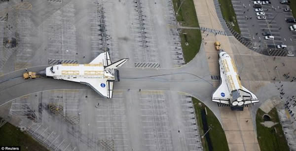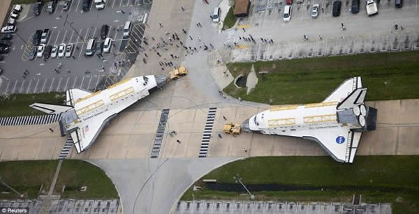 发现号(右侧)正被拖向奋进号,在完成拆解和整理工作后它们将各奔东西,而另一架退役的航天飞机亚特兰蒂斯号则将留在肯尼迪航天中心供展览之用
