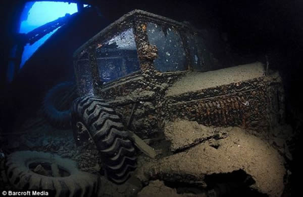 一辆锈迹斑斑的吉普车躺在该船的货舱里