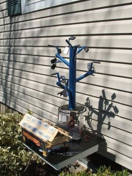 艾丹将这架“橡树型”太阳能电池组与他自己制造的另一只普通平板电池组放在相同环境下进行实验,并分别测量两者的发电量。结果证明,外形与橡树相似的太阳能电池组发电量远远高于普通太阳能电池组。特别是在太阳高度最低的冬至日当天,新型电池组的发电量比传统电池组整整高出50%。艾丹认为,这是因为前者的电池板排列方式大大增加了电池组接收太阳能的面积。
