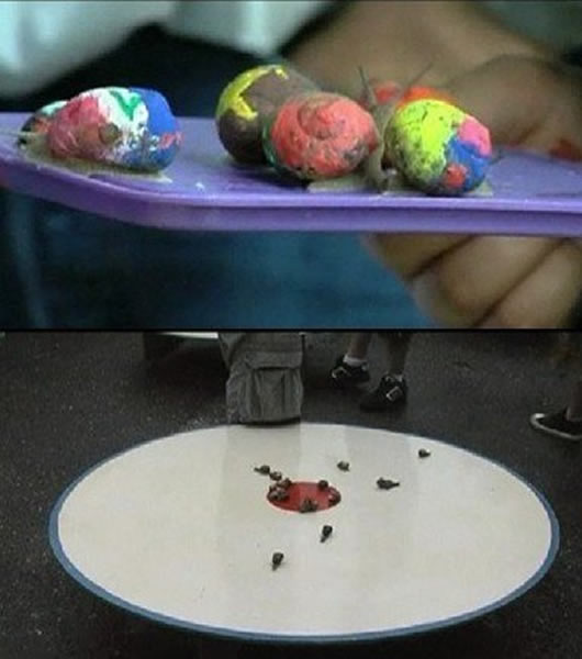 这场比赛民众除了自备“蜗牛战士”外,其它有兴趣的人也可以向主办单位申请“选手”,一起参加比赛。“蜗牛赛跑”锦标赛的规则也十分有趣,参赛的蜗牛先在桌面中央一个圆形范围内待命,一同开始向外爬行,最早到达桌缘的“选手”就获得胜利。
