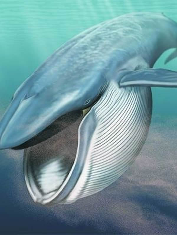 现在全世界蓝鲸仅剩大约1万头,它们靠捕食磷虾和其他海洋生物为生。蓝鲸的嘴犹如巨穴,长着宽大的上颌和富有弹性的下颌,它张大嘴巴时,能够让超过自身重量的海水进入口中。由于没有牙齿,蓝鲸利用上颚的刚毛把这些东西从海水里过滤出来。