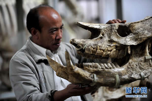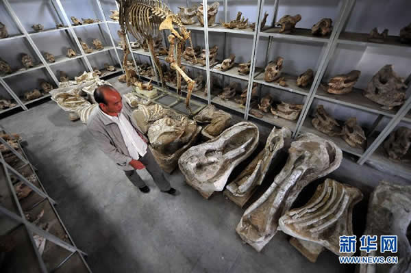 陈善勤在和政古动物化石博物馆的化石修复仓库内查看一具大唇犀复原骨架