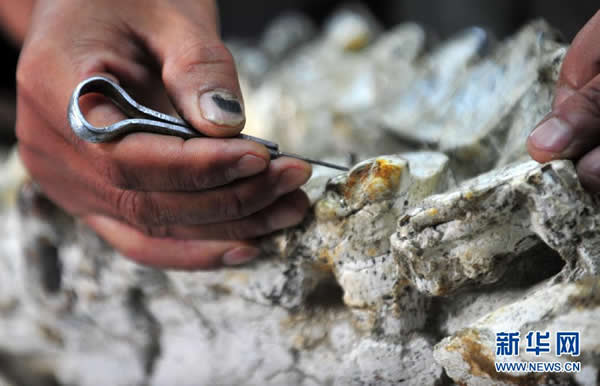 据古生物学家考证,地处青藏高原和黄土高原交汇地带的和政县,在距今3000万年至250万年间是各种古脊椎动物繁衍生息的乐园。作为负责化石修复工作的副馆长,陈善勤几乎每天都与这些奇形怪状的石头待在一起。“做化石修复,首先要能耐得住寂寞”陈善勤说,由于古动物生理构造各异,化石又脆弱易碎,进行修复必须具备很强的专业技术。日常的修复工作就是用各种工具一点点的剥离、修补,枯燥而乏味。陈善勤从事古动物化石修复工作已经有十几年了。