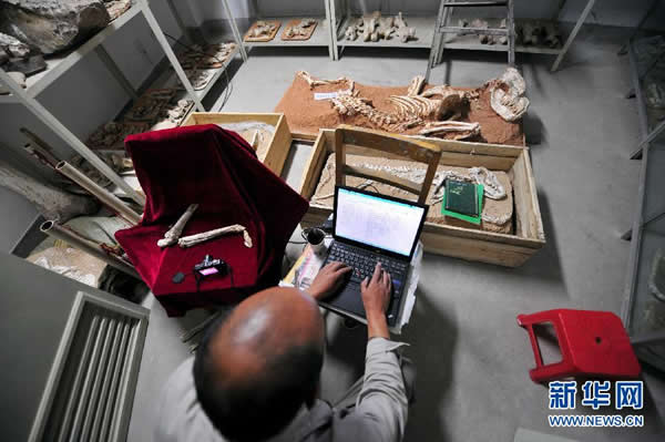 在和政古动物化石博物馆化石仓库内,陈善勤正在电脑上进行馆藏标本档案整理录入工作。