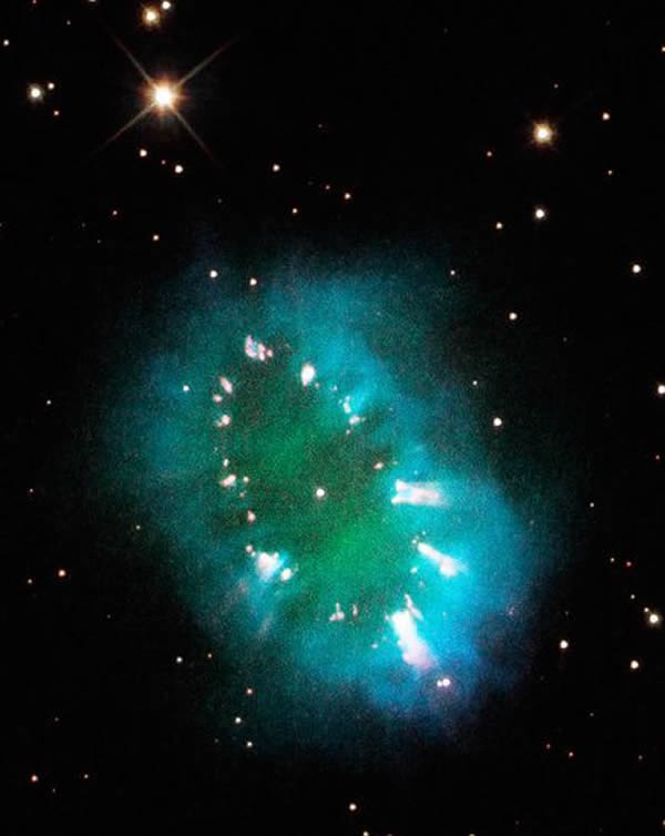 大约1万年前,这颗濒死的恒星膨胀成一颗巨大的红巨星,并吞噬了它的伴星。但是它的伴星并没有被彻底摧毁,而是继续在它低密度的体内围绕其核心运转,这样的搅动造成巨量的恒星物质被向外抛射出去,形成了这个壮观的光环。