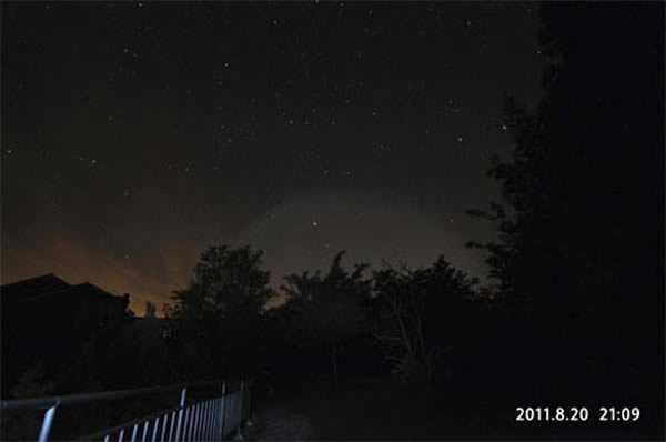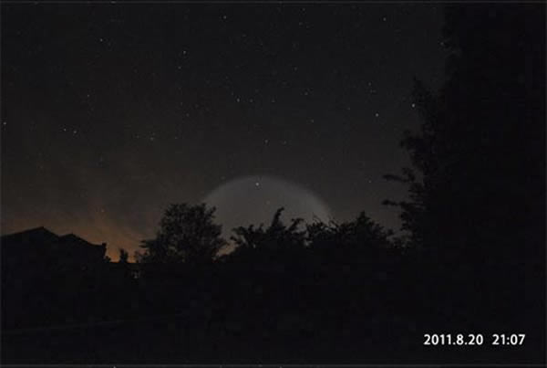 “在西边,一个巨大的气泡与地平线接壤。”虞骏说,从目视结果推测,气泡比月亮要大数百倍。并且,它逐渐膨胀。“我们都傻在当场,只知道盯着它看,甚至忘记了记录时间。”逐渐地,气泡慢慢变淡,直至消失。根据人们事后判断,这一过程大约持续了5分钟。虞骏说,后来才得知,他们并不是这起UFO事件的唯一目击证人。“在我们以东距离超过60千米的国家天文台兴隆观测基地,工程师马劲几乎在同一时刻发现了这个气泡。”最不可思议的目击报告来自数千公里外的上海空域。飞行员“采姑娘的小蘑菇168”也在微博上报告说,发现不明巨大发光体。