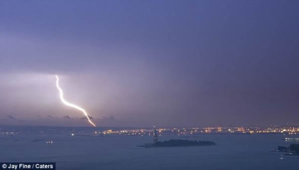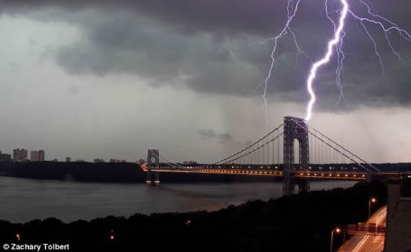 纽约前阵迎来雷雨天气,漆黑一片的夜空电闪雷鸣。一名摄影师有幸捕捉到闪电击中乔治华盛顿大桥的惊人瞬间。