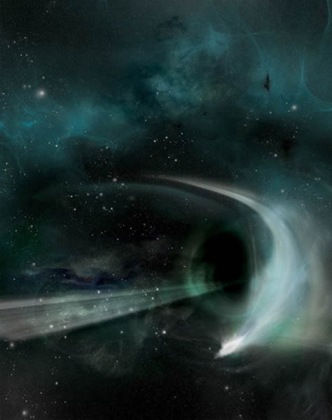 艺术家用插话描绘出黑洞吞噬恒星的过程,这被认为是目前宇宙最神秘、最震撼的情景。据悉,图中的黑洞距地球约40亿光年。