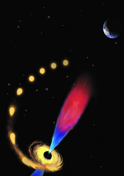 黑洞在吞噬恒星之后放射出等离子喷流。这一壮观的景象在距离地球40亿光年的太空区域上演