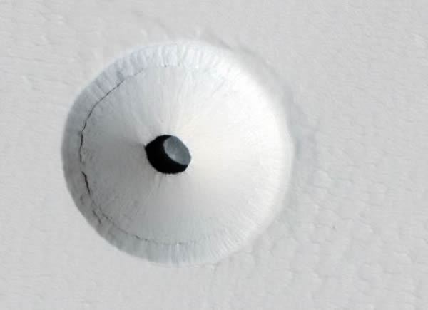这幅照片于最近对外公布,展现了火星上一个好似“天窗”的地下洞穴,阳光在洞底投下月牙形影子。圆形开口可能通向一个熔岩管,在表面熔岩凝固时形成,地下的熔岩仍在流动,最后逐渐枯竭,形成一个洞穴。照片由美国宇航局的火星侦察轨道器拍摄。这个地下洞穴直径115英尺(约合35米)。阴影帮助科学家计算出洞底的直径,大约在65英尺(约合20米)左右。