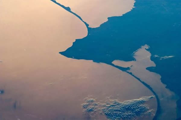 照片由国际空间站上的宇航员于8月22日拍摄,展现了俄罗斯加里宁格勒附近的两个淡水泻湖,黎明的阳光投下玫瑰色的影子。两个泻湖与波罗的海之间被陆地隔开,陆地在半岛的每一侧弯曲。顶部的泻湖是库尔什斯基湾,位于立陶宛附近,也被称之为“库罗尼安泻湖”,底部的泻湖是维斯图拉泻湖。