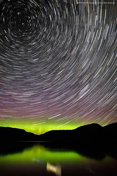 加拿大不列颠哥伦比亚省苏加尔湖上空的星辰轨迹,与糖果色的极光遥相呼应,煞是好看。这幅长曝光照片于7月拍摄,星辰好似环绕北天极(左上的光点)移动。北天极是一个与北极星最近的假想中的点,北极星几乎正对着地球自转轴。