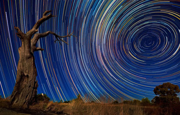 乍一看去颇像一副电脑绘图的作品或者是摄影家曝光过度,产生的一副“失败”作品。但事实上,这却是由一位36岁的摄影师经过15个小时的努力拍摄,才实现的星星踪迹图片。