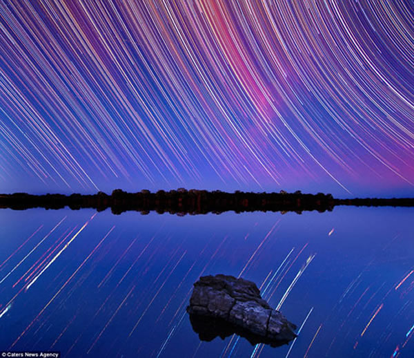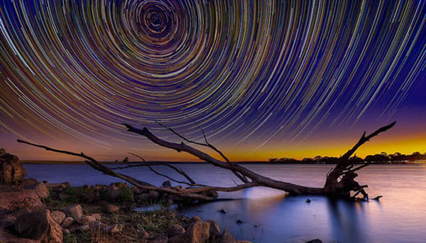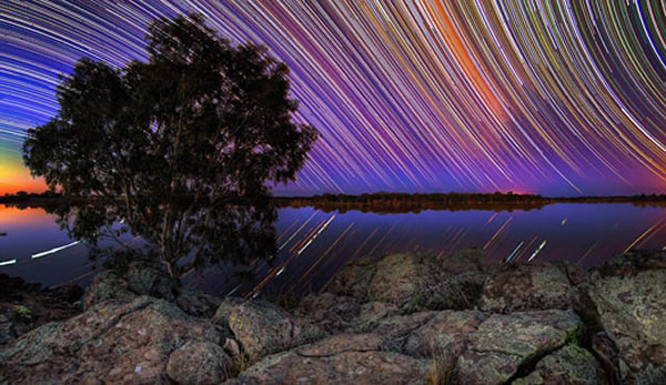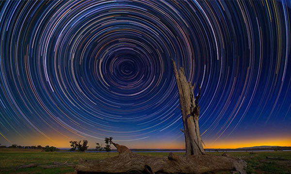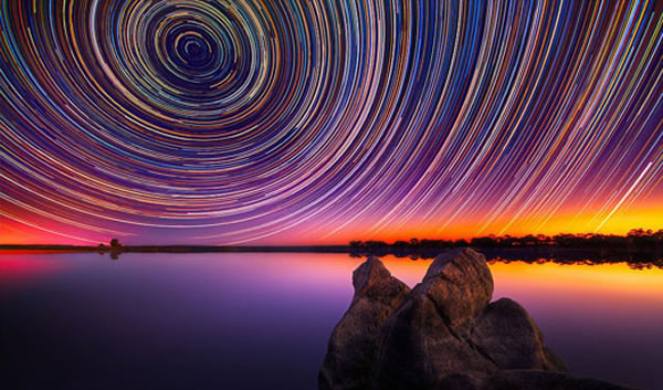 据悉,摄影师林肯-哈里森(Lincoln Harrison)并不是一名专业摄影师,他为了在eBay网上拍摄并出售服装,才于去年买了他的第一部相机。据他描述,拍摄当晚的环境条件很艰苦,他是在澳大利亚本迪戈附近的Eppalock.湖上空拍摄行到星星的踪迹。澳大利亚的深冬十分寒冷,他就在这样的条件下,从日出等到日落,花了整整15小时,几乎一晚上都呆在外面。他在拍摄时用的是长曝光镜头,随着地球的旋转,星星在上空也就划出了这样美丽的踪迹。而在他拍摄到的所有星星踪迹图片中,最喜欢的是一幅以紫黄色为背景的作品,他还将它命名为“黎明火花”。
